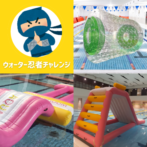 大きな水上アスレチックに挑戦!落ちずにクリアを目指そう♪※幼児・バタ足10m以上出来ないお子様は保護者同伴必須